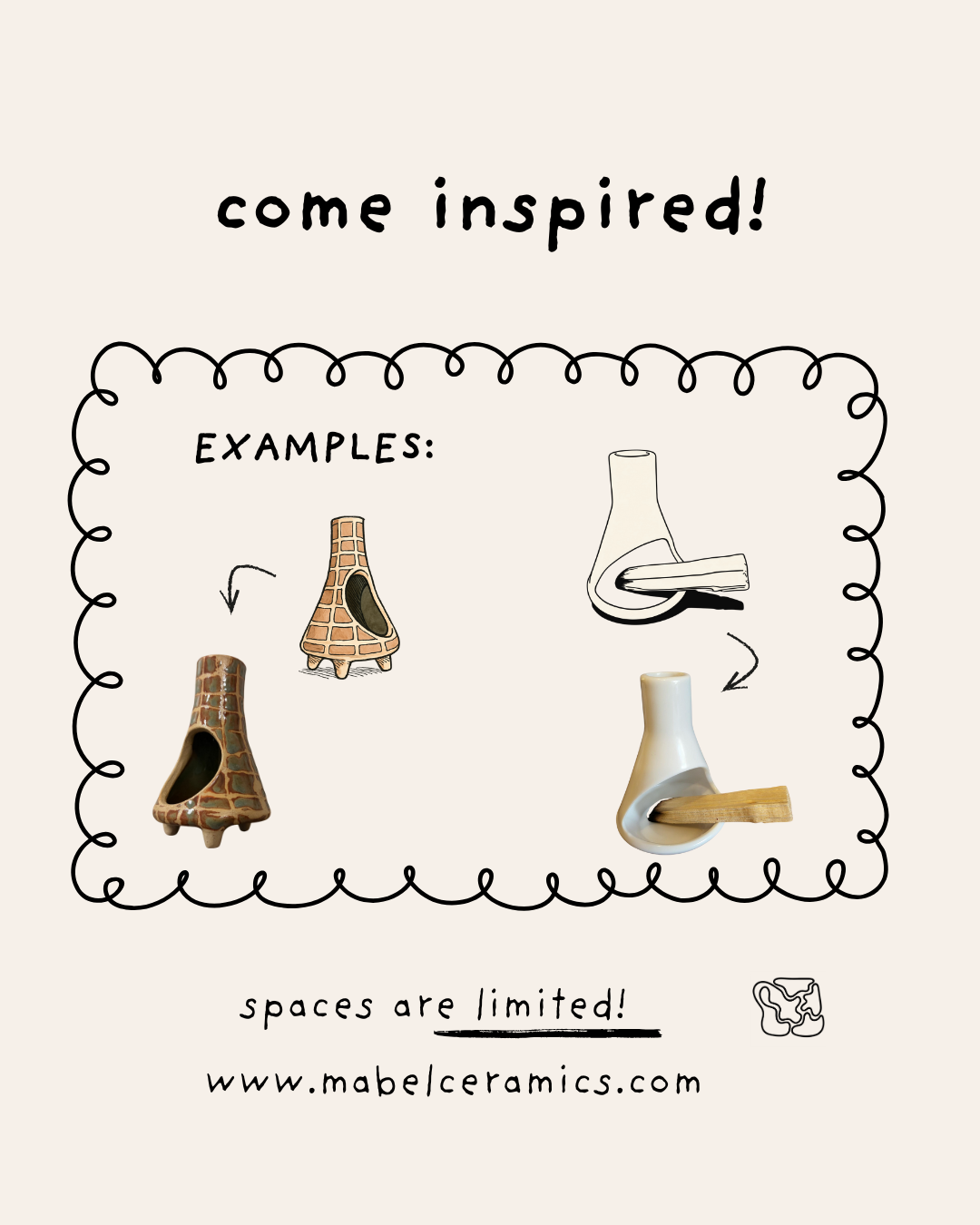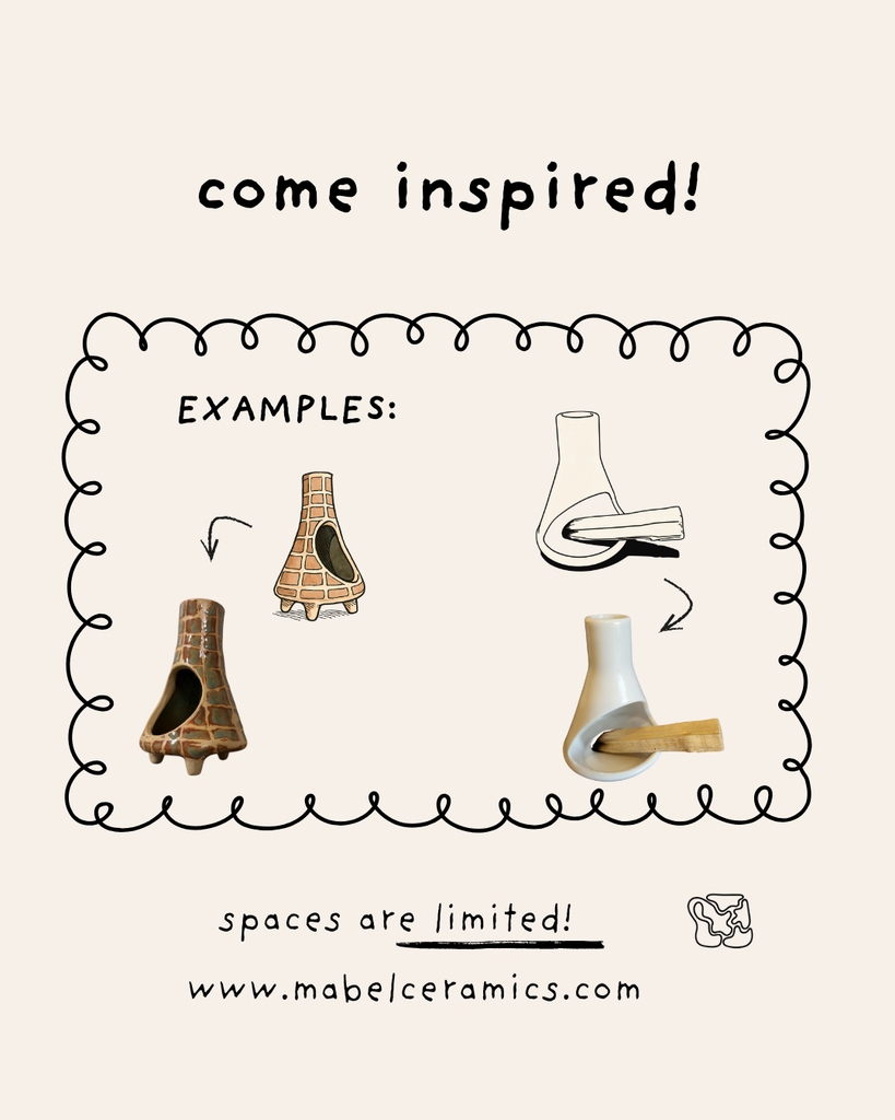 We begin by assembling the parts for the chiminea using the slab building technique. Once assembled, the class will learn various surface design techniques + take the time to apply what they've learned to personalize their piece.